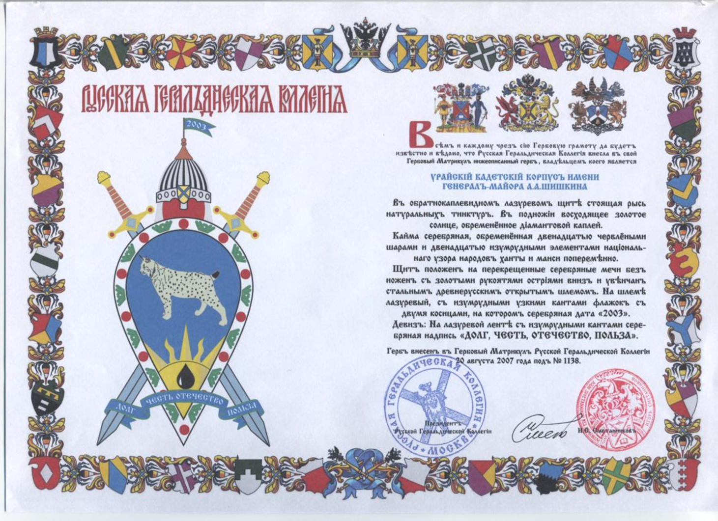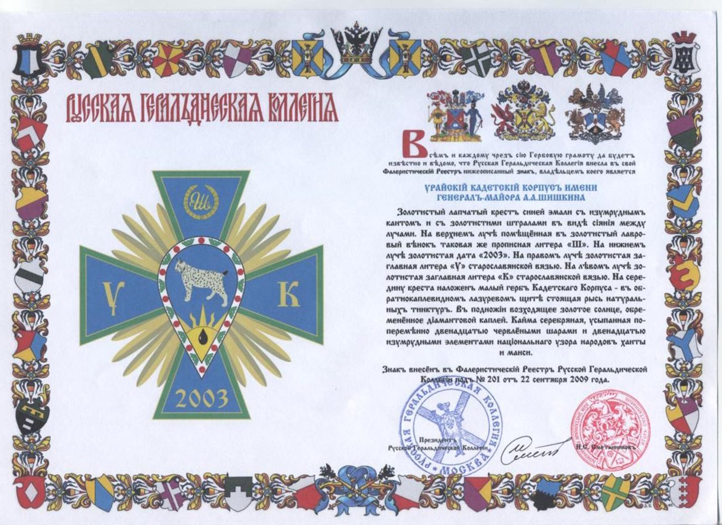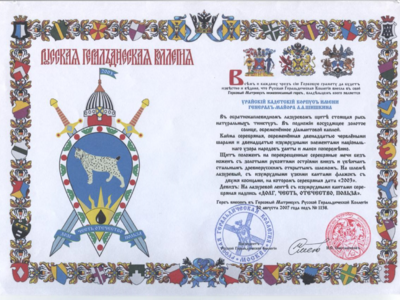В 2008 году были разработаны и переданы на регистрацию в Российскую Геральдическую коллегию геральдическое обеспечение Урайского кадетского корпуса: Герб, Знамя, Нагрудный знак.
